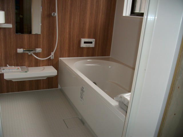 在来浴室が経年劣化で掃除もしにくくなり、タイルの冷たさもリフォーム検討した決め手。リビングもリフォームさせていただき、他の部屋と同様なイメージでアクセントパネルは木目調でナチュラルに。お掃除もしやすくなりました。