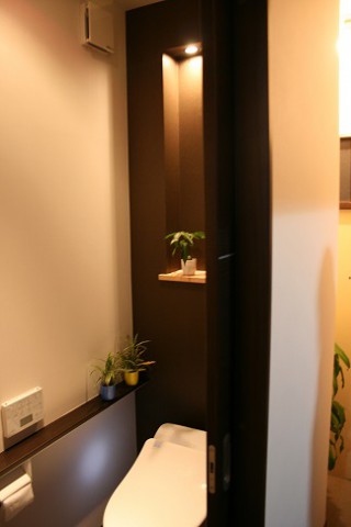 家族が使用しやすい様に和式から洋式トイレへ施工。設備の交換だけでなく、個室を広く・手洗い器設置収納棚設置・おしゃれな空間が希望。給排水管工事から施工し、1坪のデザイントイレを施工しました。トイレはタンクレスで内装のクロスは1面はアクセントクロスにしました。