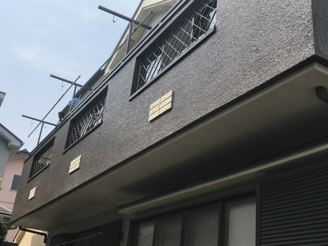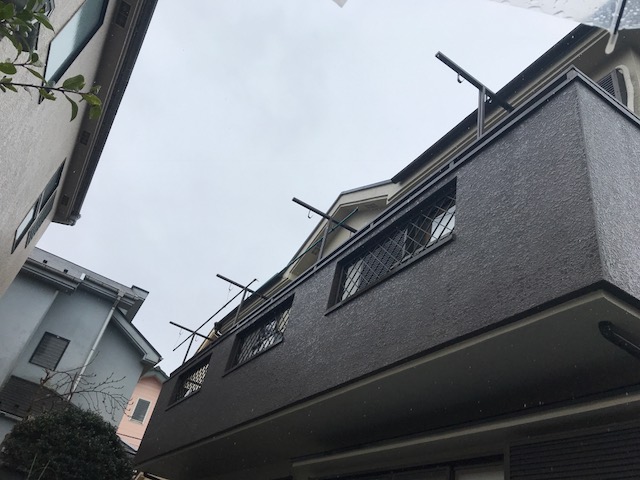 外壁塗装後、ベランダの塗装色が落ち着いた色合いでアクセントが欲しいので相談しタイルでのアクセントを提案して頂き施工。