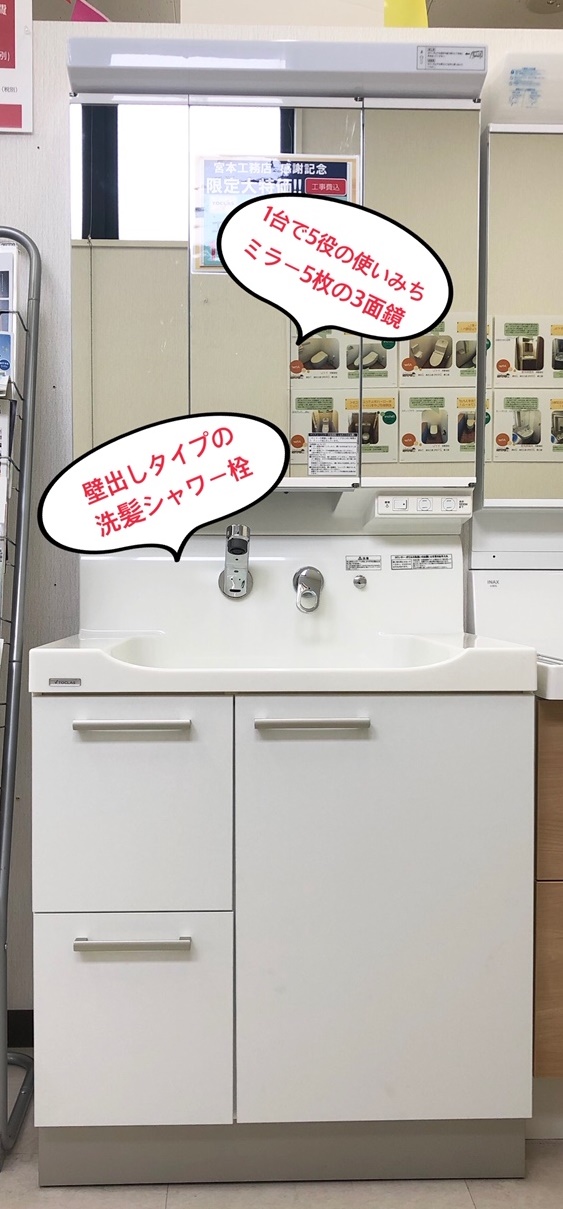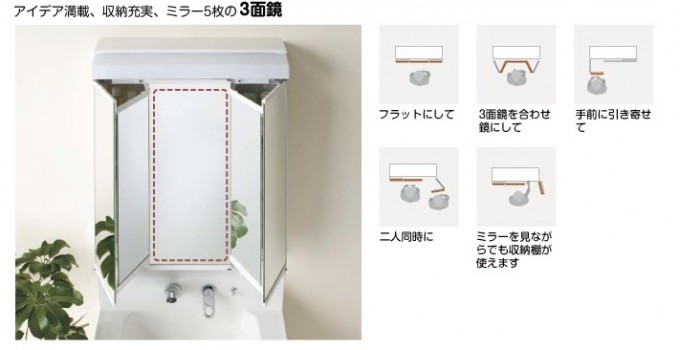 ミラー5枚の3面鏡を高機能収納が自慢のミラーキャビネット