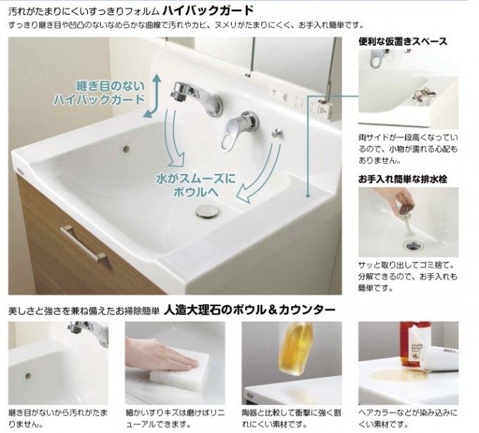 お掃除しやすいフォルム、優れた素材を採用したボウル&カウンター