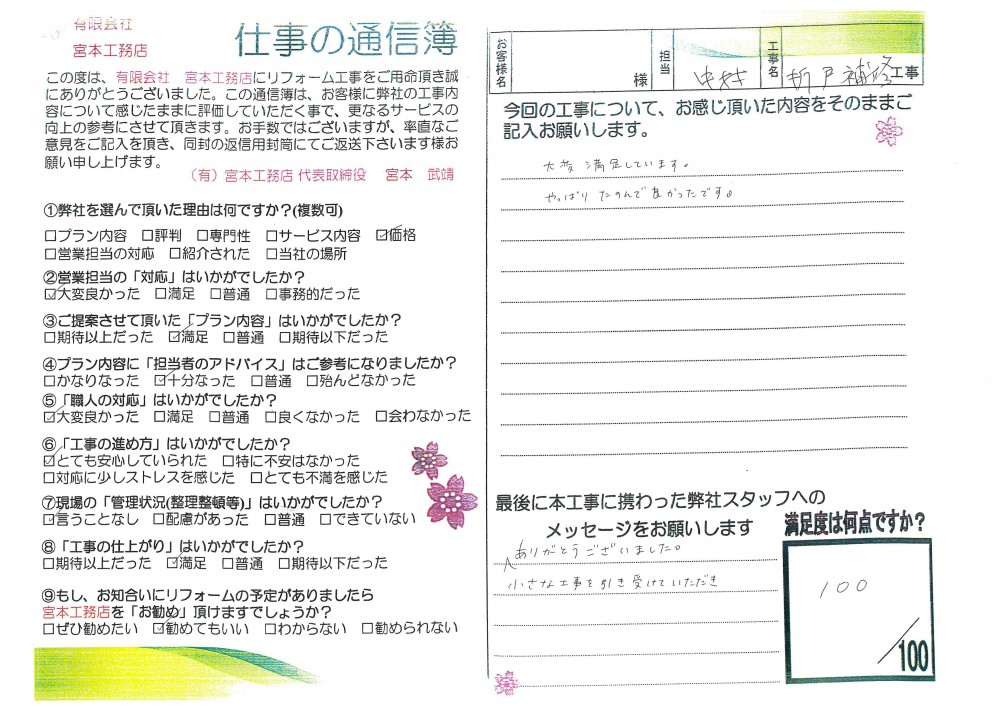 K様、工事の際は大変お世話になりました。ありがとうございました。