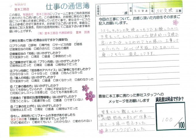 ・今回の工事について、お感じ頂いた内容をそのままご記入お願いします。