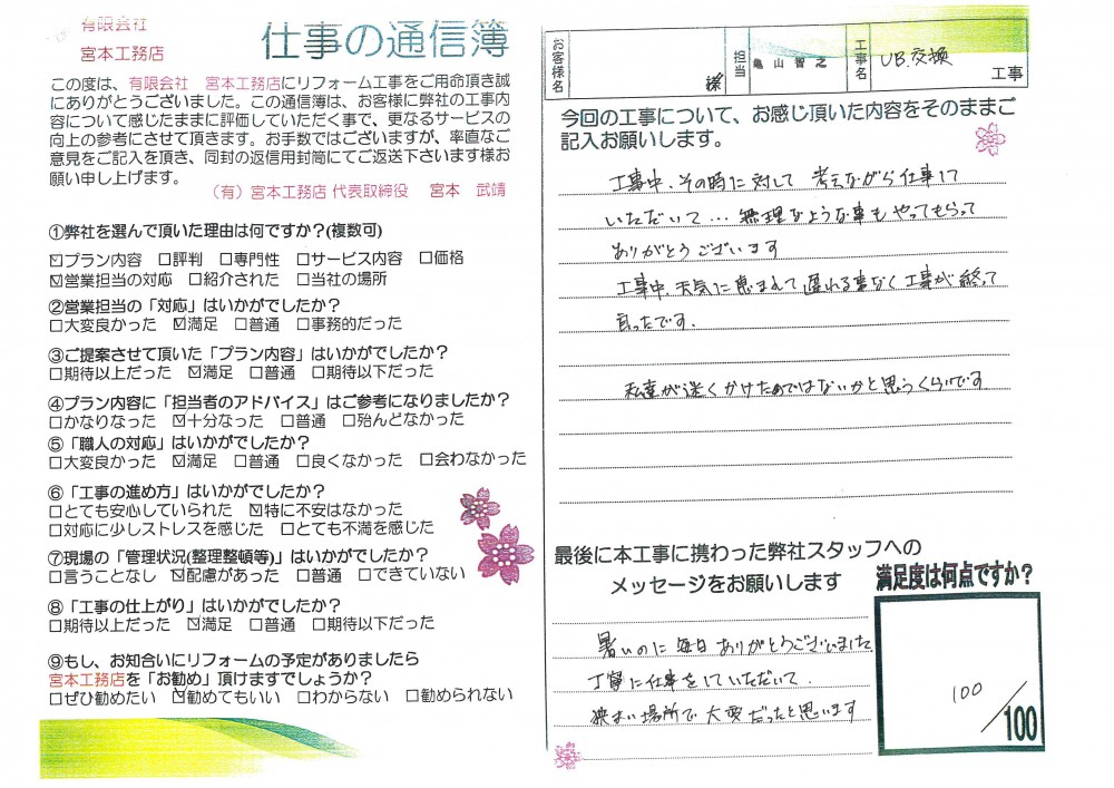 I様、ユニットバスリフォーム工事の際は大変お世話になりました。
