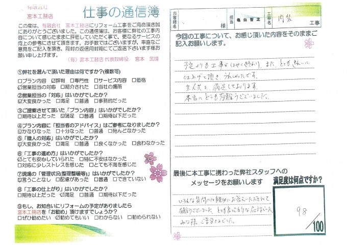 ・今回の工事について、お感じ頂いた内容をそのままご記入お願いします。