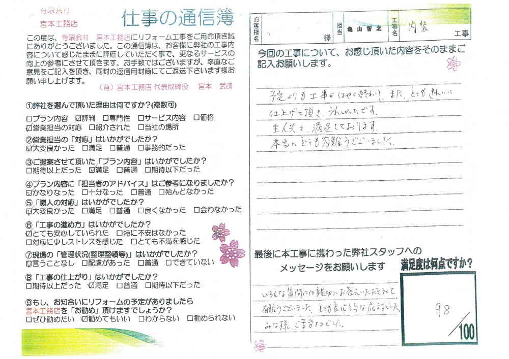予定よりも工事が早く終わり、またとてもきれいに仕上げて頂きうれしかったです。