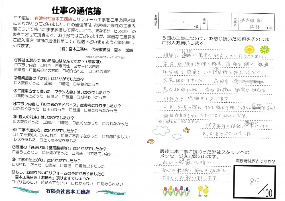 相談に的確に素早く対応していただきました。前回の雨漏り修理の際も原因を調べ最適な方法を提案、しかも低価格に抑えて下さり 大変助かりました。