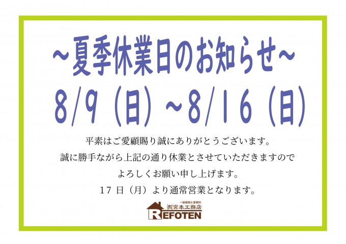 「夏季休暇」による休業日のおしらせ