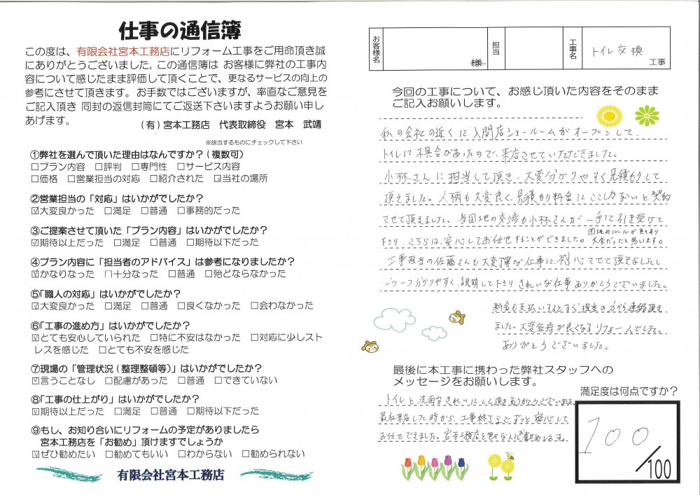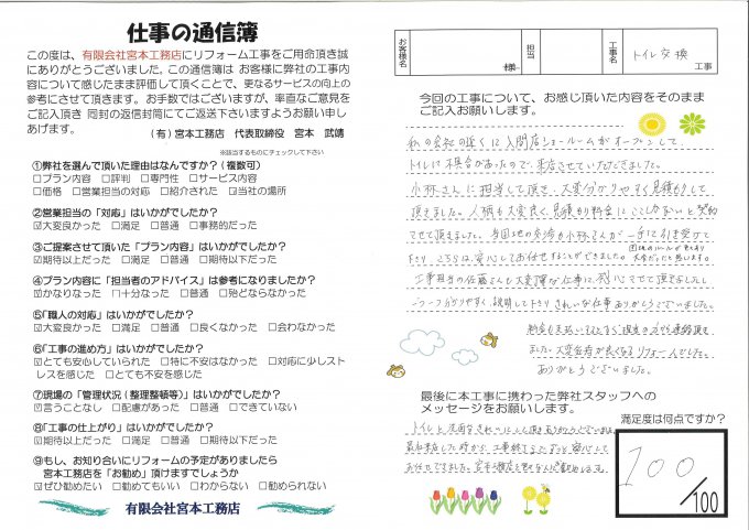 ・今回の工事について、お感じ頂いた内容をそのままご記入お願いします。